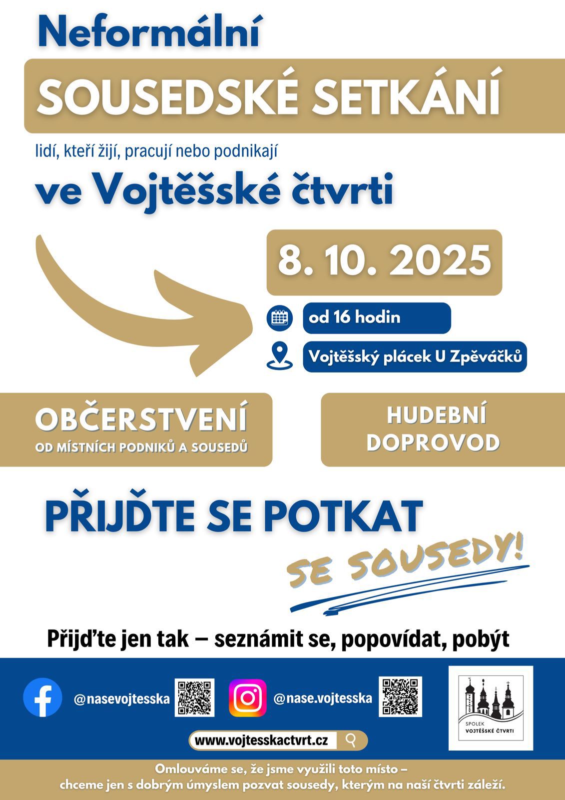 I tentokrát vás čeká živá hudba, malé občerstvení od místních podniků a přátelská atmosféra. Nově navíc sousedskou tombolu – a stejně jako minule budeme moc rádi, když se zapojíte i vy: přineste něco malého na ochutnání, co sami doma upečete nebo připravíte. Každý koláč, pomazánka nebo napečený plech něčeho dobrého přispívá k tomu, aby bylo naše setkání opravdu společné.